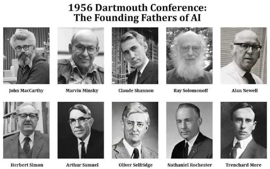 The 1956 Dartmouth Conference was a milestone in AI history, introducing the concept of artificial intelligence and laying the foundation for research in this field. The image includes pioneering figures such as John McCarthy (the "Father of AI"), Marvin Minsky (a pioneer in machine learning research), and Claude Shannon (the "Father of Information Theory"), whose contributions continue to shape the trajectory of AI development.