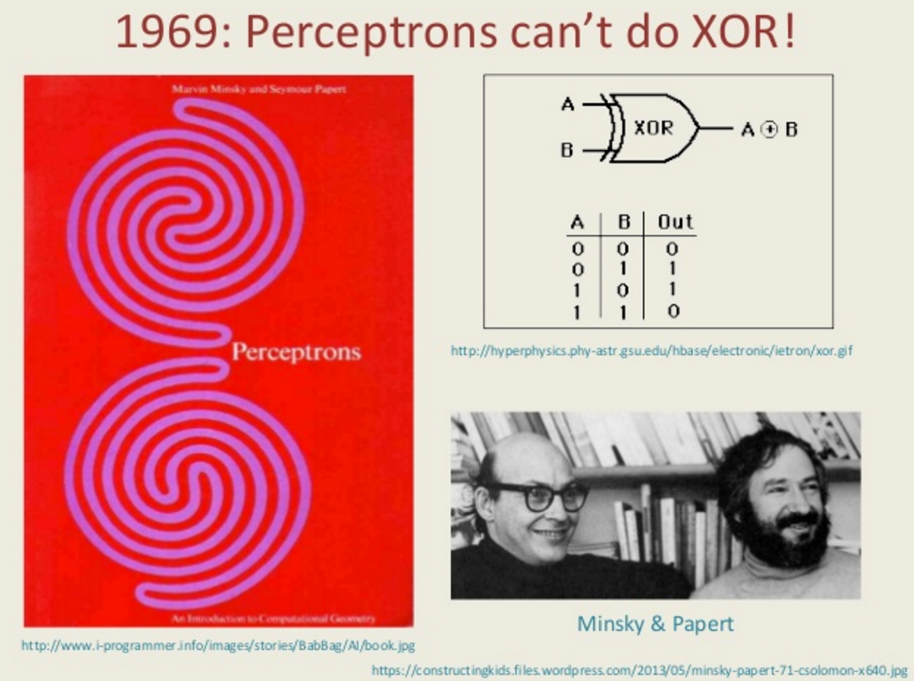 Neural networks also faced a major setback. In 1969, Marvin Minsky and Seymour Papert published Perceptrons, pointing out that single-layer perceptrons could not solve nonlinear classification tasks, such as the XOR problem. This critique led to widespread skepticism about neural networks, drastically reducing research funding and stalling progress in the field.