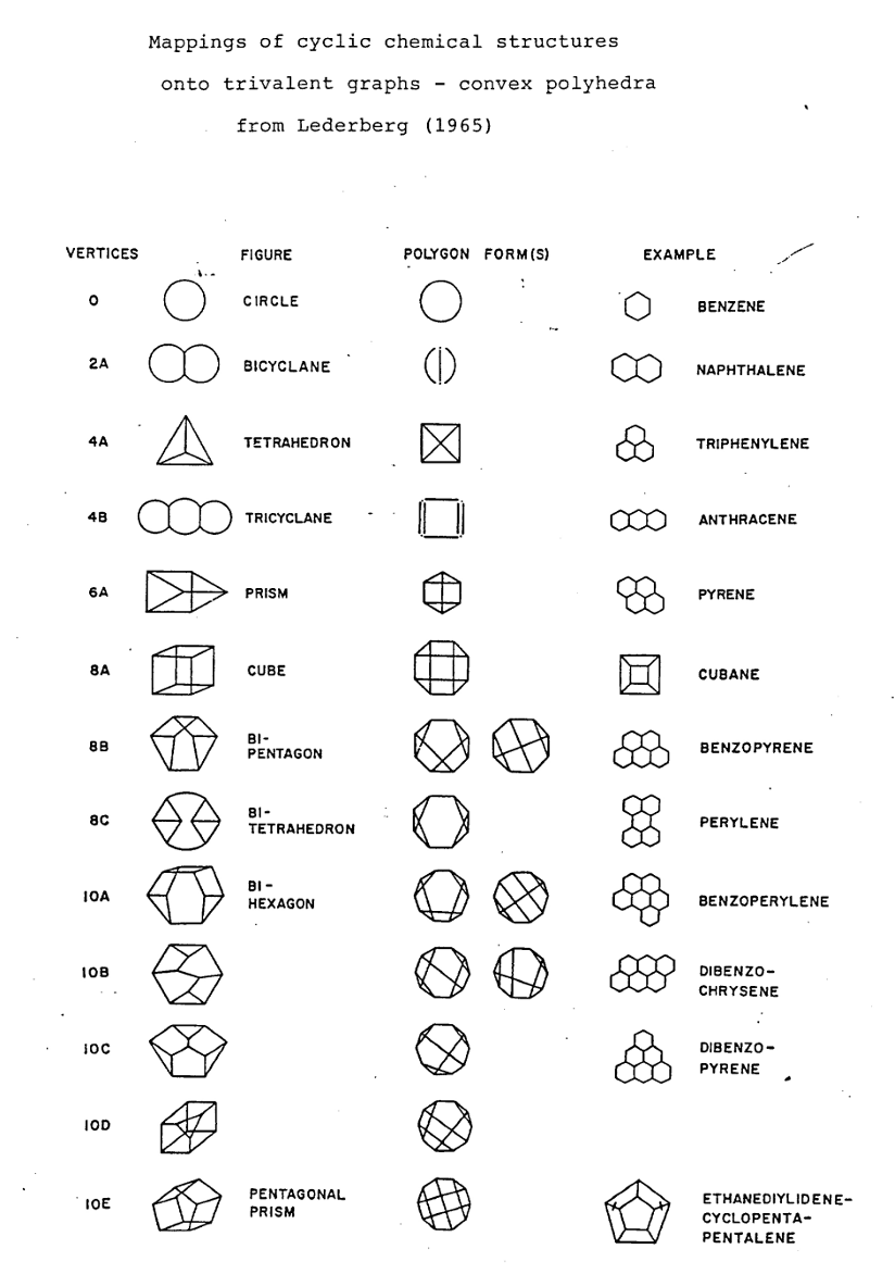 The image above maps ring structures in chemical molecules to trivalent graphs and convex polyhedra. The chart classifies structures by vertex count, illustrating the topology of simple benzene rings to more complex polycyclic aromatic compounds and demonstrating how they can be modeled using graph theory.